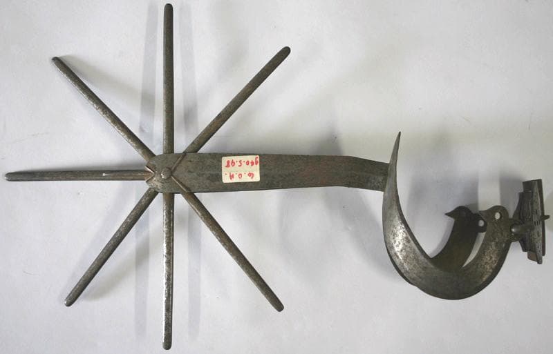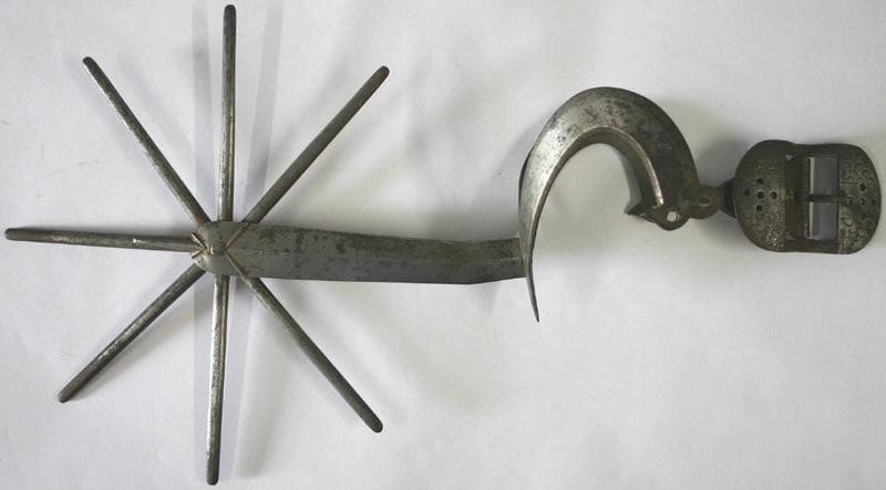 très difficile à dater : peut-être contemporain du casque de cavalerie 'bourguignotte capeline' ; voir aussi : Eperon à molette COOA 940.5.47