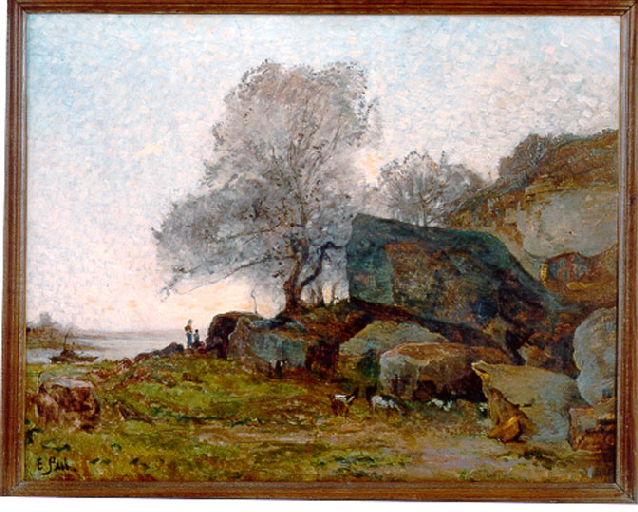 paysage (chemin, Loire, rocher, carrière, chèvre, chêne, personnage)