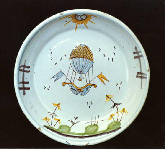 Marli souligné d'un filet ou s'accrochent un soleil, deux barrières et un paysage avec arbustes de style chinois. Au centre, une montgolfière dont la nacelle porte deux étendards est entourée de nuées d'oiseaux.