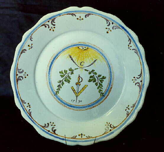 Bord décoré de deux filets dont l'un supporte des motifs décoratifs et de fleurons. Au centre, dans un médaillon, un soleil rayonnant, deux rameaux d'acacia croisés, une épée, une équerre et la lettre G.