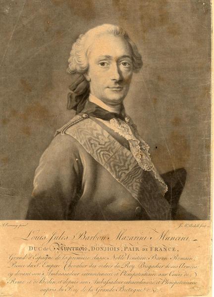 inscription donnant l'identité du modèle, en bas : Louis Jules Barbon Mazarini Mancini Duc de Nivernois, Dijonois, Pair de France ; inscription donnant l'identité auteur, en bas à gauche et à droite : A Ramsay pinx.t J Mc Ardell fécit ; inscription, en bas : Grand d'Espagne de la première classe, Noble Vénitien, Baron Romain, Prince du St Empire, Chevalier des ordres du Roy. Brigadier de ses Armées, cy devant son Ambassadeur extraordinaire et plénipotentiaire aux cours de Rome et de Berlin, et depuis son Ambassadeur extraordinaire et plénipotentiaire auprès du Roy de la Grande Bretagne