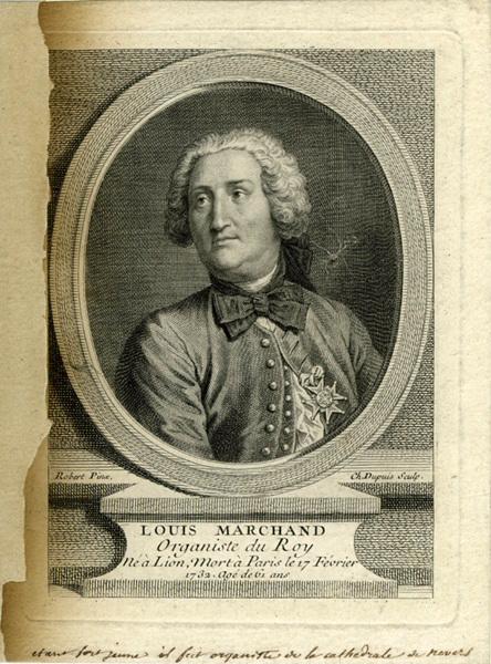 inscription donnant l'identité du modèle, en bas au centre : LOUIS MARCHAND Organiste du Roy né à Lion, mort à Paris le 17 Février 1732 agé de 61 ans ; inscription donnant l'identité auteur, en bas à gauche : Robert Pinx. ; inscription donnant l'identité auteur, en bas à droite : Ch. Dupuis Sculp.