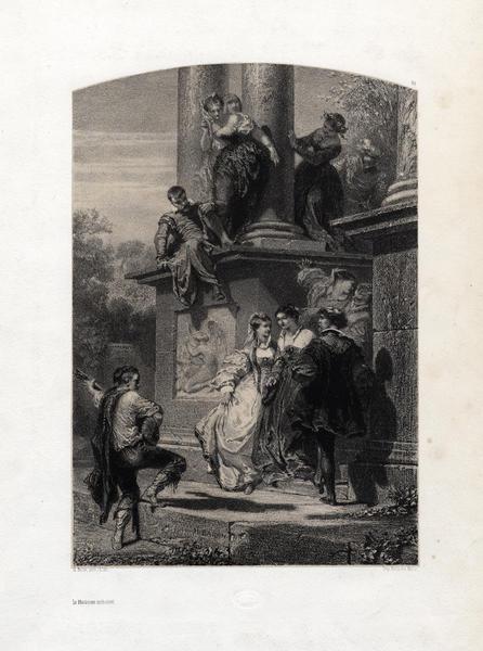 Scène représentant un musicien dans un parc, jouant de la mandoline devant deux énormes pilliers soutenant des colonnes. Des jeunes gens discutent et jouent autour de lui. D'autres personnages se tiennent sur les pilliers.