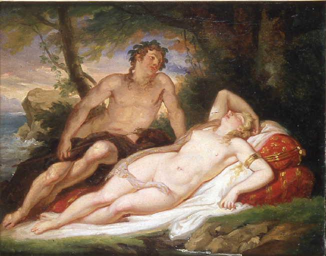 scène mythologique (Bacchus, Ariane, nudité,sommeil) ; fond de paysage (Naxos, bord de mer)