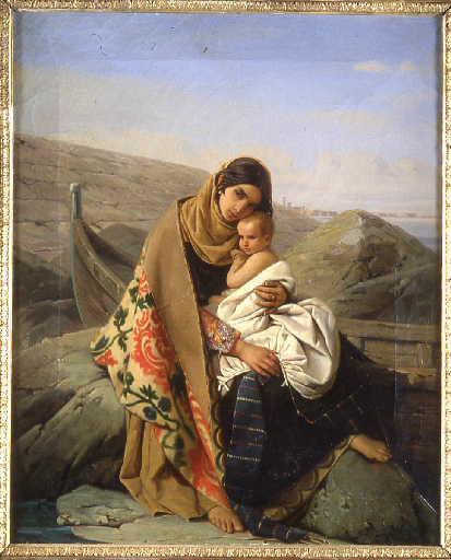 scène (mère, nourrisson, étreinte, assis, pied : nu, barque) ; fond de paysage