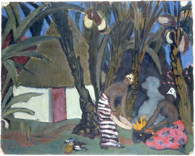 Esquisse pour une décoration : deux femmes allumant un feu dans un jardin planté de bananiers