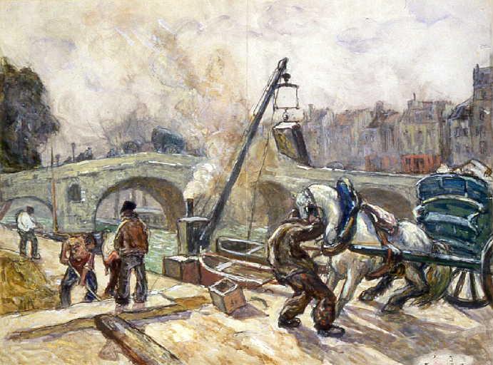 Débardeurs et charretiers sur un quai, le long d'un canal. Au premier plan à droite, un homme essaie de maîtriser un cheval attelé à une carriole. A gauche, quatre hommes travaillent. On aperçoit des bateaux sur le canal, un pont à gauche et à l'arrière-plan, un ensemble de maisons.