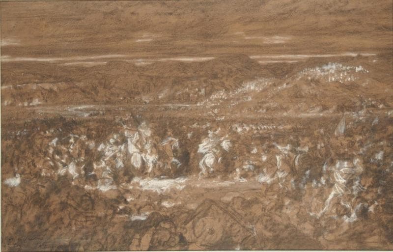 Esquisse pour la peinture réalisée pour le château de Dampierre et appartenant au Duc de Luynes, terminée en 1852, pour laquelle le musée des Beaux-Arts de Beaune conserve une esquisse de détail. En 1849, le duc de Luynes (Honoré Théodoric Paul Joseph d'Albert duc de Luynes 1802-1867), président de la Commission permanente des Beaux-Arts, membre de l'Institut, directeur adjoint du musée des antiquités grecques et égyptiennes, écrit à J.A. Guignet pour lui commander trois tableaux au prix de 5000F chacun pour son château de Dampierre (vallée de Chevreuse), demeure du XVIe S. Ingres y décora la salle des fêtes, Rude y installa le Louis XIII enfant en argent massif (Dijon, Musée des Beaux-Arts). Le travail pour Guignet consistait à orner trois (puis quatre) panneaux d'une salle à manger au rez-de-chaussée, travail à exécuter en trois ans. Guignet choisit lui-même les sujets: 'un sujet assyrien, un sujet persan, et un sujet biblique en Egypte'. Les panneaux furent les suivants: 'Le Festin de Balthazar' (1849-50), 'la Bataille de Châlons' (il devait être placé face aux fenêtres; des reflets gênant la vision, on décida de lui substituer 'Moïse sauvé des eaux' mais il apparaît que ce Moïse n'a jamais été mis en place), 'Renaud dans les jardins d'Armide' (sujet choisi par la duchesse de Luynes). Le quatrième panneau qui resta inachevé fut 'Agar et Ismaël'. Ici, la bataille est figurée au moment où 'les Francs, commandés par Mérovée, leur roi, et les Visigoths conduits par le vieux Théodoric, se confondent dans une mêlée horrible avec la masse innombrable des Alains et des Huns, fondus et anéantis dans cette étreinte puissante, et où Aetius, du haut d'une éminence, domine l'armée des Barbares, pousse sur eux, comme un torrent, ses bataillons romains qui vont décider la victoire'. (La Fizelière, 1854) ; en rapport avec : A. Guignet, Trois cavaliers, A. Guignet, La Bataille de Châlons