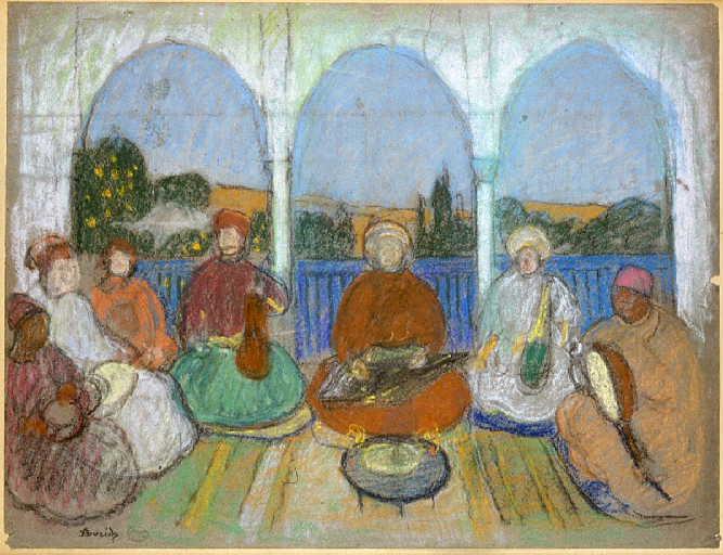 Etude pour le tableau 'Séance de musique arabe'. Ici, seule la composition générale est indiquée : les visages et le décor sont à peine esquissés