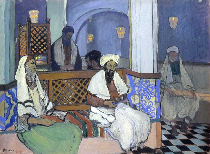 Service religieux dans la synagogue de Tlemcen au cours duquel plusieurs des officiants récitent les psaumes sacrés. Derrière eux, les hommes séparés par une grille de bois ajourée. Esquisse pour 'Les psaumes' (Oran, Musée Zabana)