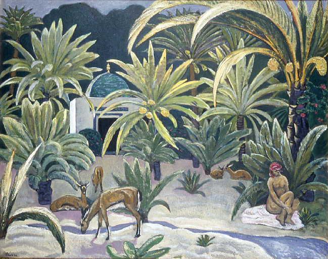 Femme nue à gauche de la composition, se reposant au bord d'un petit cours d'eau. Auprès d'elle s'abreuvent et se reposent quelques gazelles, dans un décor de palmiers et de dattiers. A l'arrière-plan, un marabout à coupole verte.