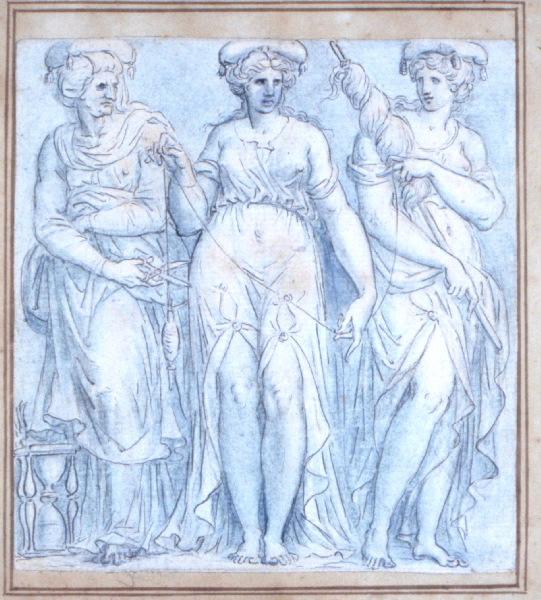 scène mythologique (Les Parques, filage, Clotho, Lachésis, Atropos, travaux d'aiguille, quenouille, vie)