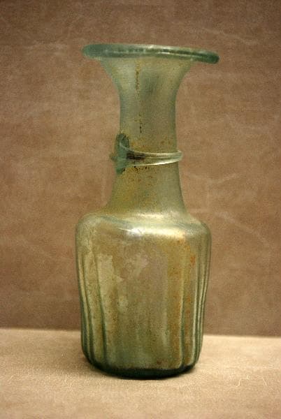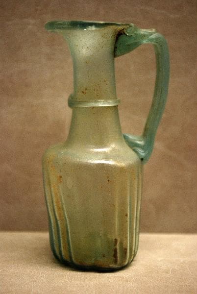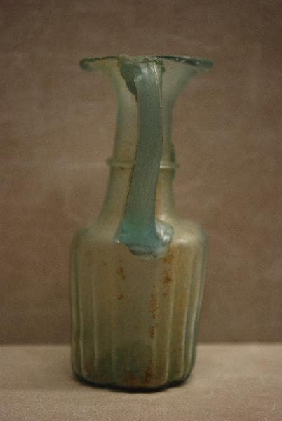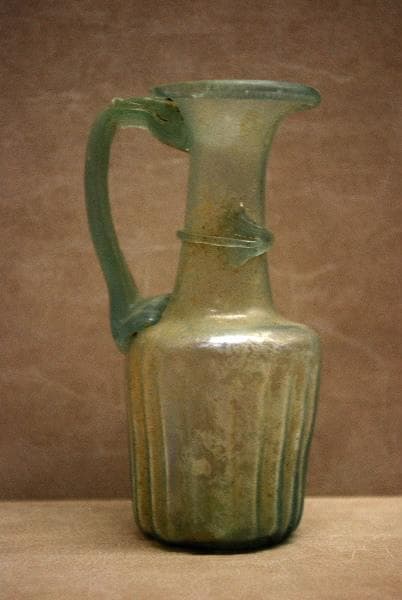 'Le verre, mélange de sable siliceux (corps vitrifiant), de soude ou de potasse (fondants) et de chaux (stabilisant), dont la découverte fortuite remonte au quatrième millénaire avant notre ère, ne fut utilisé en tant que matière indépendante qu'à partir du deuxième millénaire, en Egypte et en Phénicie, qui exportèrent leurs productions autour de la Méditerranée. Grâce à l'invention de la canne à souffler le verre au premier siècle avant J.C., l'industrie verrière fut importée en Italie par des verriers orientaux, puis elle s'installa en Gaule où des ateliers s'établirent aux premier et second siècles de notre ère. La production des récipients en verre soufflé à l'air libre ou dans des moules se développa alors. Le goût du luxe se marqua dans le nord de la Gaule et en Germanie par une production de verre presque incolore dont la pureté était due à l'usage des décolorants, mais aussi à un choix plus strict des matériaux soumis à la fusion. Dès le milieu du quatrième siècle, la pureté du verre tend à disparaître et il révèle une coloration vert-brun caractéristique. Souvent trouvées dans les sépultures où elles sont placées à côté des restes du défunt, les verreries ont, cependant, eu en premier lieu un usage typiquement domestique. Les urnes retrouvées dans les tombes appartiennent à des formes qui ont servi auparavant de jarres. Les fouilles de la ville gallo-romaine d'Alésia par exemple ont fourni un nombre considérable de fragments se rattachant aux formes des ollae. Les bouteilles, les carafes, les barillets ont contenu des liquides et du vin, les balsamaires et fioles, des baumes et parfums avant d'accompagner le mort, renfermant alors des offrandes liquides (vin ou miel mélangé de lait) ou des parfums pour plaire aux dieux. Au départ, les verriers copient les formes céramiques (urnes, aryballes) et les formes de la vaisselles en bronze (coupes côtelées, encore appelées coupes à godrons, anses de carafe imitant les anses de métal et décorées d'un mascaron à leur base). Très vite, cependant, maîtrisant de plus en plus la matière vitreuse ils créent des formes telles que des bols, des carafes, des verres à pied, des bouteilles, des barillets, des tonnelets, formes caractéristiques de cet art. La fabrication du verre fut donc intense à l'époque gallo-romaine. Les verreries présentées ici en témoignent largement, et donnent un vaste panorama de cette production et de la diffusion de la vaisselle en verre dont on retrouve des parallèles non seulement en Bourgogne, mais aussi dans toute la Gaule et en Germanie. Autun, Augustodunum, 1987, pp. 143-151, n° 235-252