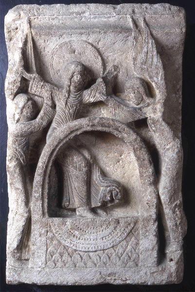 bas-relief représentant l'Assomption de la Vierge nimbée, portant sur la tête un voile qui lui retombe sur les épaules, revêtue d'une tunique à plis bouillonnés, sort d'un tombeau dont la face apparente est ornée d'imbrications et à demi recouverte d'un suaire. Bien que son corps est encore engagé entre le tombeau et l'arcade qui le surmonte, elle est soulevée dans les airs par 2 anges, aux ailes relevées