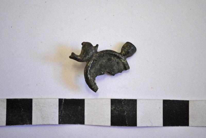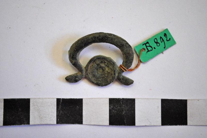 'Fibule de type Riha 7.21, à médaillon. La partie centrale de ces fibules, circulaire et évidée, est destinée à recevoir une incrustation en os, en verre ou en métal (feuille d'argent). Cette partie est encadrée par différents types de guirlandes ou d'animaux stylisés. [...]' B.892.1 : pastille pris dans un omega. B.892.2 : pastille surmonté d'un masque et à gauche, un dauphin. Labaune, 2000, p. 20-25 ; 'Fibule, bronze, représentant deux serpents accolés, la tête opposée supportant un cercle émaillé avec lentille centrale brisée. Long. 0,024.' Inventaire B. Bulliot