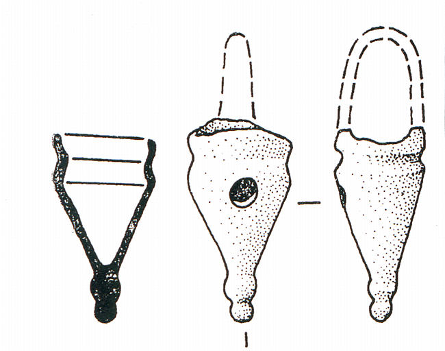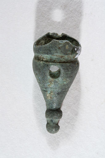 Incomplète. Pendeloque creuse, au corps de forme conique percé de part et d'autre à sa partie supérieure, au profil mouluré. L'anse de suspension a disparu.