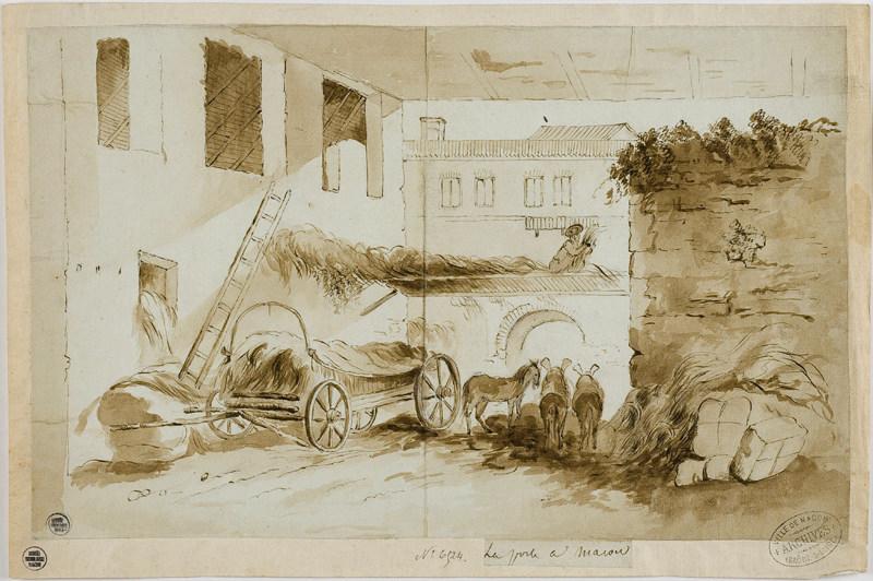 vue d'architecture (Mâcon, bâtiment, foin, cheval, voiture à attelage)