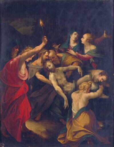 Cette très belle peinture, encore une fois entrée dans les collections grâce au legs de Melle Ronot - legs injustement décrié - fait l'objet de nombreuses interrogations. Cette Déposition ou Mise au tombeau a jusqu'alors été classée dans le milieu flamand du 17e siècle. Son support de métal doit en être la raison, de même que la densité chromatique de cette scène nocturne. Le maniérisme appuyé de la composition, où les personnages dans l'excès de leur gestuelle s'entrechoquent plus qu'ils ne dialoguent, induit la connaissance, par cet artiste encore anonyme, des maîtres florentins Pontormo, Rosso... Dos féminin en premier plan, bras levé tenant une torche cachant partiellement le visage, jeux de bras et de mains qui scandent l'espace, regards qui se croisent tout en formant des groupes isolés dans leur douleur... tout concourt à la dramaturgie de cette fin de nuit sur le Golgotha. La chromie à la fois sourde et acidulée contribue elle aussi à placer cette oeuvre dans le contexte maniériste, non pas des initiateurs, mais dans celui, international, des élèves ou suiveurs occasionnels. Cet air de ' déjà vu ' ne devrait pas occulter les pistes moins connues des maniéristes d'Europe centrale. Il faudrait peut-être chercher du côté de Hans von Aachen, né à Cologne en 1552, formé dans un atelier flamand de cette ville. En 1574, il part pour l'Italie : Venise, Rome avec son milieu maniériste flamand, puis Florence. Les oeuvres oscillent entre une voie plus personnelle et l'assimilation des trouvailles des maniéristes italiens où la sinuosité des lignes joue avec des coloris précieux. Il s'installe à Prague en 1596, devient peintre de Rodolphe II, introduisant le maniérisme international. C'est là qu'il décèdera en 1615. En tout état de cause, il convient de situer cette peinture dans le contexte d'un atelier actif à l'extrême fin du 16e ou au début du 17e siècle. ML
