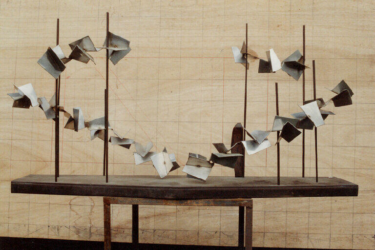Sur un plateau en tôle : acier de forme hexagonale oblongue, vingt couples de carrés en acier inoxydable, pliés dans le rapport 1/3 - 2/3, soudés opposés, formant une chaîne vrillée ouverte selon un plan au sol en '8', l'ensemble étant soutenu par huit mâts en acier de hauteurs différentes, disposés symétriquement par rapport à un point central