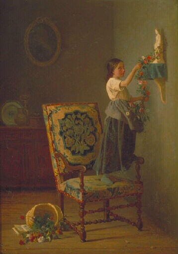 Scène d'intérieur; dans une pièce au parquet de bois, on aperçoit au fond un buffet décoré de vaisselle et un moulin à café avec au dessus un tableau ovale. Une très jeune fille est grimpée sur un fauteuil en tapisserie Louis XIII. Elle pose une guirlande de fleurs autour d'une statue de la Vierge installée sur une console ornée d'un tissu bleu. Au sol, sur le côté gauche un livre ouvert et un panier garni de fleurs est renversé. Le jeune fille en chaussettes porte un tablier relevé sur sa jupe. La composition de ce charmant tableau s'ordonne au long d'une diagonale : un jeté de fleurs fraîchement cueillies, tombées naturellement emmêlées d'un panier d'osier, un bouquet, construit en symétrie, sur le médaillon du dossier d'un fauteuil Louis XIII et une légère guirlande tressée pour entourer, comme un ornement ou une prière, une statuette de la Vierge Marie. La très jeune fille qui réalise cette offrande est elle aussi au printemps de sa vie et associée, par la même, au thème floral. La lumière qui vient de la gauche vient renforcer cette ligne dynamique en éclairant la scène. Au fond de la pièce, comme un dernier rappel, un plat en faïence claire orné d'une fleur attire le regard vers la petite nature morte organisée sur le buffet. (Nane Tissot)
