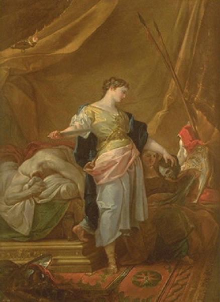 scène biblique (Judith, Holopherne, meurtre, cadavre, tête, lit, estrade, tapis, draperie, poignard, lance, bouclier, lampe à huile, bonnet phrygien)