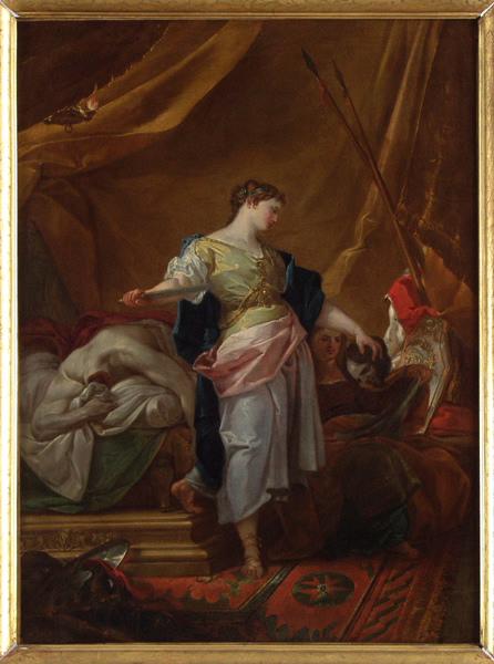 L'histoire du général Holopherne est tirée de l'Ancien Testament. Il est envoyé en campagne par Nabuchodonosor dans tout le Proche-Orient pour enfin assiéger Béthulie, où vit Judith. Cette dernière sauve sa ville en séduisant et décapitant Holopherne.; Parmi les scènes du Livre de Judith dans l'ancien testament, les artistes ont surtout retenu celle où la veuve de Massané, prince de Béthulie, petite ville de Palestine, tranche la tête d'Holopherne, général de Nabuchodonosor II, qui assiège la cité. Dans ce récit légendaire, beaucoup de distances sont prises par rapport à l'histoire et à la géographie; seul est retenu le courage de l'héroïne, personnification du peuple juif qui, grâce à son alliance avec Dieu, peut vaincre ses plus redoutables adversaires. La belle jeune femme ose s'introduire dans le camp ennemi accompagnée seulement d'une suivante - le personnage peu visible assis à droite du tableau qui reçoit la tête du général assyrien. Revêtue de sa toilette de fête, elle séduit Holopherne qui l'attire sous sa tente. Elle profite alors de l'ivresse de ce dernier pour lui trancher la tête d'un coup de cimeterre. Dans ce tableau, Corrado Giaquinto, artiste européen oeuvrant à la fois en Italie - Naples, Turin, Rome - et en Espagne pendant la première moitié du XVIIIe siècle, utilise à la fois une ampleur scénographique avec de lourdes draperies, du mobilier d'apparat, des armes et des trophées, ainsi qu'une richesse de coloris. L'accentuation dramatique des effets de lumière qui sont dignes des plus grands formats, avec une composition très structurée, très ramassée à l'échelle de l'espace du tableau, centrée sur la très décorative figure féminine de Judith. in 100 peintures des collections, 1999.