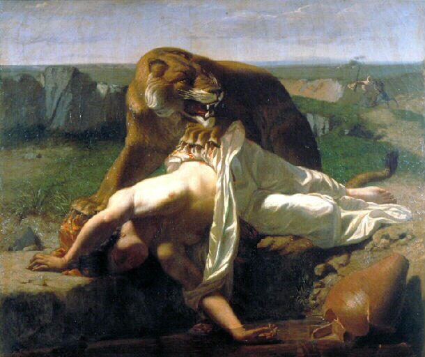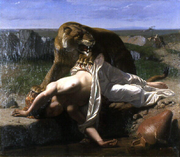 Mission Laclotte, mars 1960 Imitateur secondaire de Delacroix. ; Louis Matout a un parcours singulier. De condition des plus modestes, il réussit, à quatorze ans, grâce à la généreuse attention d'un architecte qu'il rencontre sur un chantier où il travaille pour survivre, à entrer à l'école des Beaux-Arts de Paris. Après une fréquentation assidue et ô combien formatrice des musées, il part pour un long périple de six ans dans l'inévitable artistique Italie. A trente-sept ans, lors d'un voyage pour l'Afrique, il fait naufrage et échoue à Alger pour y rester un an. Et c'est ainsi que, durant un déplacement, il est témoin, près d'un point d'eau, de la tragique découverte d'une indigène tuée par une lionne où, curieusement, l'animal reste auprès d'elle. Ce drame le frappe et le pousse à peindre un tel tableau en 1853. Dans une prodigieuse technique, l'académisme se manifeste sans ambages dans cette peinture. Ainsi, la femme à terre semble être un modèle posant dans ' l'atelier du peintre '. Le corps, d'une blancheur laiteuse, disposé d'une manière très peu naturelle, est pourvu d'un drapé amidonné. La redoutable lionne, d'une cruelle domination, s'inscrit dans la construction comme un monolithe massif. La poterie brisée à même la source accroît le sentiment d'instantanéité tragique dans la brutale surprise de la jeune indigène toute occupée à remplir sa cruche. Ce tableau est présenté en premier au musée du Luxembourg en 1856, où le douanier Rousseau le remarque et s'en inspire pour peindre, en 1897, la Bohémienne endormie. Par la suite, la peinture de Matout rejoint en 1889 le musée du Louvre pour enfin entrer en 1892, par un dépôt de l'Etat, dans les collections des musées de Mâcon. JCC