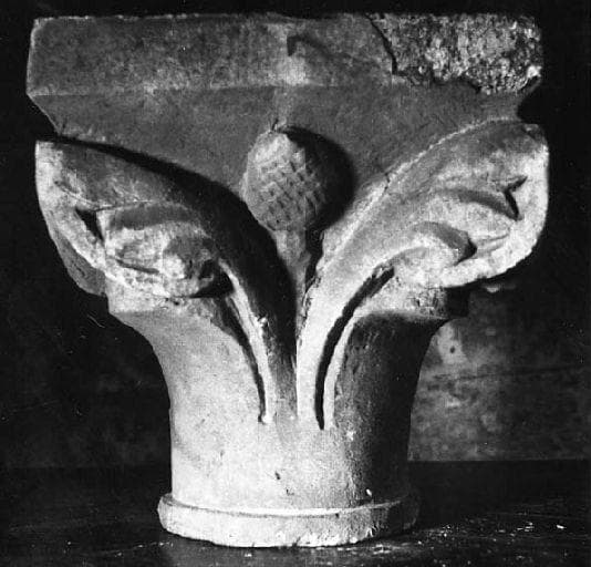 Chapiteau tronconique à décor de grandes feuilles constituant les angles du chapiteau, et au centre, surmontant une tige, une 'pomme de pin'. Abaque droit