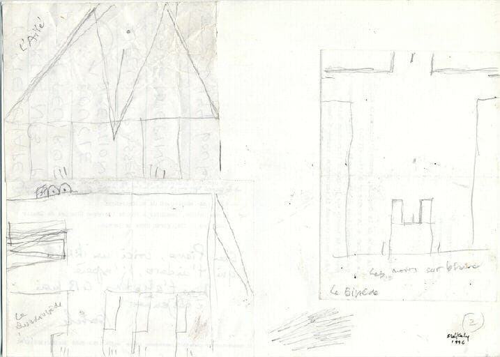 Sur le dessin h.g, inscrit au graphite en h.g : L'Ailé ; Sur le dessin b.g., inscrit au graphite en b.g : Le / Quadrupède ; Sur le dessin d., deux titres sont inscrits au graphite en b : Les noirs sur blanc / Le Bipède ; Inscrit au graphite sur la feuille cartonnée A4 : 1996 ; Inscrit au stylo feutre noir sur la feuille cartonnée A4 : székely ; Inscrit au graphite sur la feuille cartonnée A4 et entouré d'un cercle : 2 ; Inscrit au graphite au dos de la feuille cartonnée A4, avec quelques rajouts au stylo feutre noir (certaines parties sont rayées) : Mon très cher maître François / Je pense encore avec émotion à ton attention consacré [dernièrement] (rajouté) durant un / long moment à ma vie privée et ma vie professionelle. / En effet, tu n'est pas mon seul ami qui me reproche / gentiment de ne pas être suffisament célèbre et en conséquence / [insuffis] (barré) pas assez riche. Je reconnais mes manquements en ces / deux domaines. Toutefois, j'ai une consolation : la certitude / que l'amitié de mes amis conserve [exclusivement] (rajouté) mon oeuvre et [moi] (rajouté, remplace la fin de la phrase barrée : ma / personne exclusivement et indubitablement.) / [C'est vrai aussi qu'en dehors de l'hotel Laffayette à Paris, je / n'ai pas le souvenir d'avoir exposé dans un grand hotel] (barré). / Par contre, si tu passe 92 rue Bonaparte à l'institut hongrois, ma sculpture 'Arpad le Conquérant 996 - 1996' y est érigée et inaugurée par / [Douste Blazy notre] (barré) mon ami le Président Göutz et mon ministre de tutel [et leur discours élogieu] (barré) / Ton fidèl chevalier sans cheval t'embrasse.