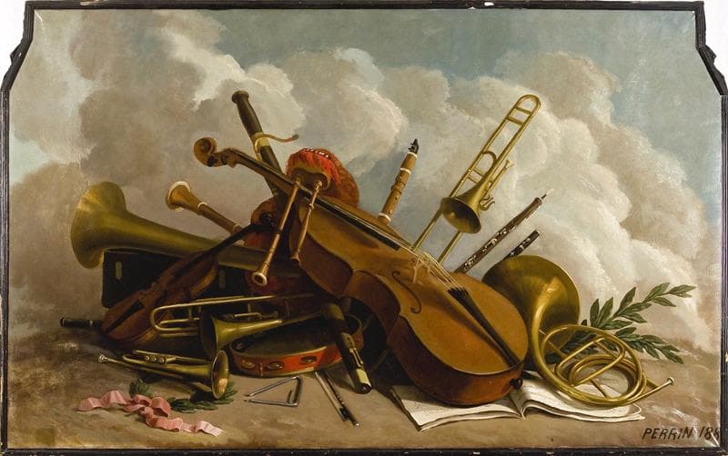 PERRIN : Lagnieu, 1831 ; Pont-de-Veyle, 1909 ; Sans doute Hippolyte Perrin était-il un artiste accompli. Cette grande peinture à usage décoratif en témoigne. Sur l'une des diagonales, un violoncelle structure la composition montrant l'éventail des instruments pratiqués par l'Union chorale de Mâcon qui détenait la toile avant d'en faire don au musée de la cité. Cette Union chorale ou Société chorale - partie intégrante de la Société de musique qui deviendra l'Harmonie municipale - se réunissait dans les locaux de l'Hôtel de Ville jusqu'à la fin du 19e siècle, selon l'étude effectuée par J-P Noly (1). Cette peinture exprime bien le regain d'activité musicale qui se manifeste à Mâcon à partir de 1884. Les cordes (violon, violoncelle), les cuivres (trombone, trompette, cor) et les vents (clarinette, hautbois, cornemuse) montrent, avec une gamme colorée claire, dans ce grand dessus-de-porte ou dessus de scène, la diversité des pratiques musicales destinées à accompagner les fêtes et cérémonies d'une collectivité ainsi que les récompenses obtenues. Elle est également emblématique de l'éclectisme des pratiques de Perrin. Peintre de chevalet, il a réalisé de nombreux paysages animés dont il ne reste que la mémoire familiale. De même une brochure sur Mâcon publiée en 1914 par Protat pour le compte du Syndicat d'Initiative nous montre opportunément la reproduction d'une peinture allégorique ovale qui ornait la pharmacie Games, décor aujourd'hui disparu. Saisissons l'occasion de cette étude pour évoquer la carrière de Perrin en tant que peintre de décor mural. Comme d'autres artistes ses contemporains, lui qui était né à Lagnieu dans l'Ain, a été attiré par le grand chantier ' néo-roman ' de l'architecte Berthier (Charolles 1811 - Mâcon 1873). L'église St-Pierre à Mâcon a été consacrée en 1867, mais plusieurs artistes y ont travaillé jusqu'à l'aube du 20e siècle : le lyonnais Jean-Baptiste Beuchot (1821 - 1884 ?) réalisa plusieurs chapelles dès 1866 pour seconder le mâconnais Claudius Clair (1822 - 1867). Victor Bussière (Cuisery 1836 - Mâcon 1905), quant à lui, aura la charge de la chapelle Ste Marie-Madeleine avec un autre mâconnais d'adoption, Joseph-Victor Constant (1824 - 1881). Citons encore Edouard Krug (1829 - 1901), venu du Calvados, qui interviendra dans plusieurs chapelles entre 1867 et 1882. Hippolyte Perrin est donc en bonne compagnie pour réaliser la chapelle St Benoît et Ste Scholastique, datée de 1871. Il poursuivra ce type de peinture à fresque, avec la technique à la cire, en réalisant une Adoration des bergers pour l'église St Vincent de la Frette dans l'Isère. Nous connaissons de ce peintre deux adresses à Mâcon : 19 rue Philibert Laguiche et 24 rue Lamartine. Il terminera les dernières années de sa carrière 5 rue des Echets à Pont-de-Veyle dans l'Ain et fera partie du conseil de fabrique de l'église de la ville (2). Marie Lapalus 1. Noly Jean-Paul, Historique de l'harmonie municipale de la Ville de Mâcon et la famille Delbecq, 5 août 2002. 2. Il semblerait également, selon Emile Magnien, conservateur, qu'il ait été le maître du peintre mâconnais Honoré Hugrel dans le cadre de ' l'entreprise Perrin ' à Mâcon.