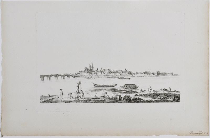 vue d'architecture (Mâcon, Saône, ville, pont, cathédrale, personnage, artisan, rivière, barque, bateau-lavoir, réparation, sciage, scie, berge)