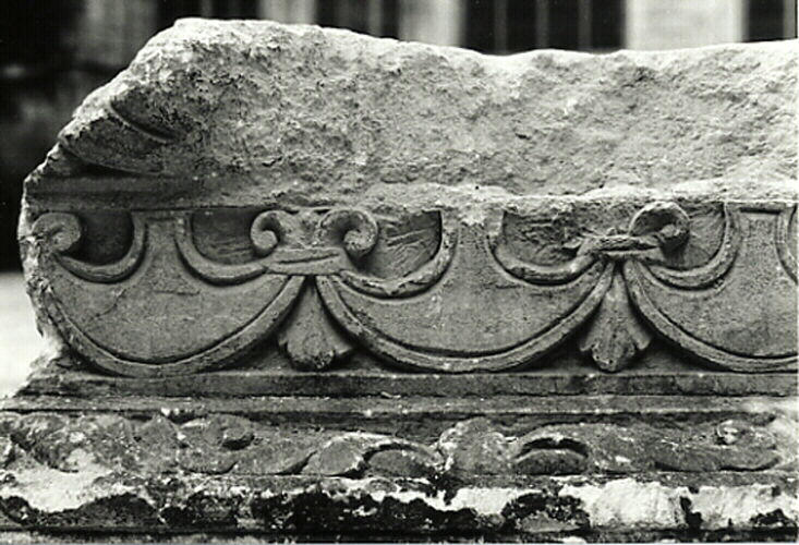 Calcaire sculpté. Ce monument funéraire est l'assise inférieure d'un piédestal dont le dé est orné sur chaque face, d'après Espérandieu, de boucliers d'Amazone liés ensemble et juxtaposés.