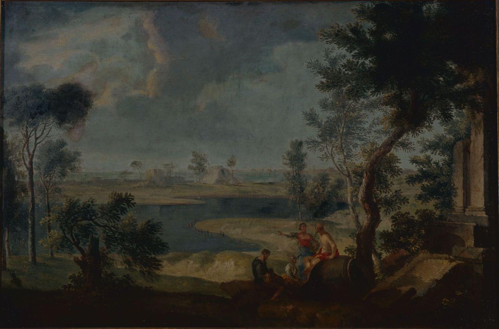 paysage (fleuve, arbre, colline, nuage, maison, ruines, statue, vase de jardin) ; homme ; nudité