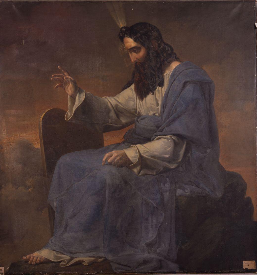 figure biblique (homme, barbe, Moïse, assis, de profil, main : levé, rayons lumineux, effet de tissu, draperie, nuée, Les Tables de la Loi, effet de soleil)