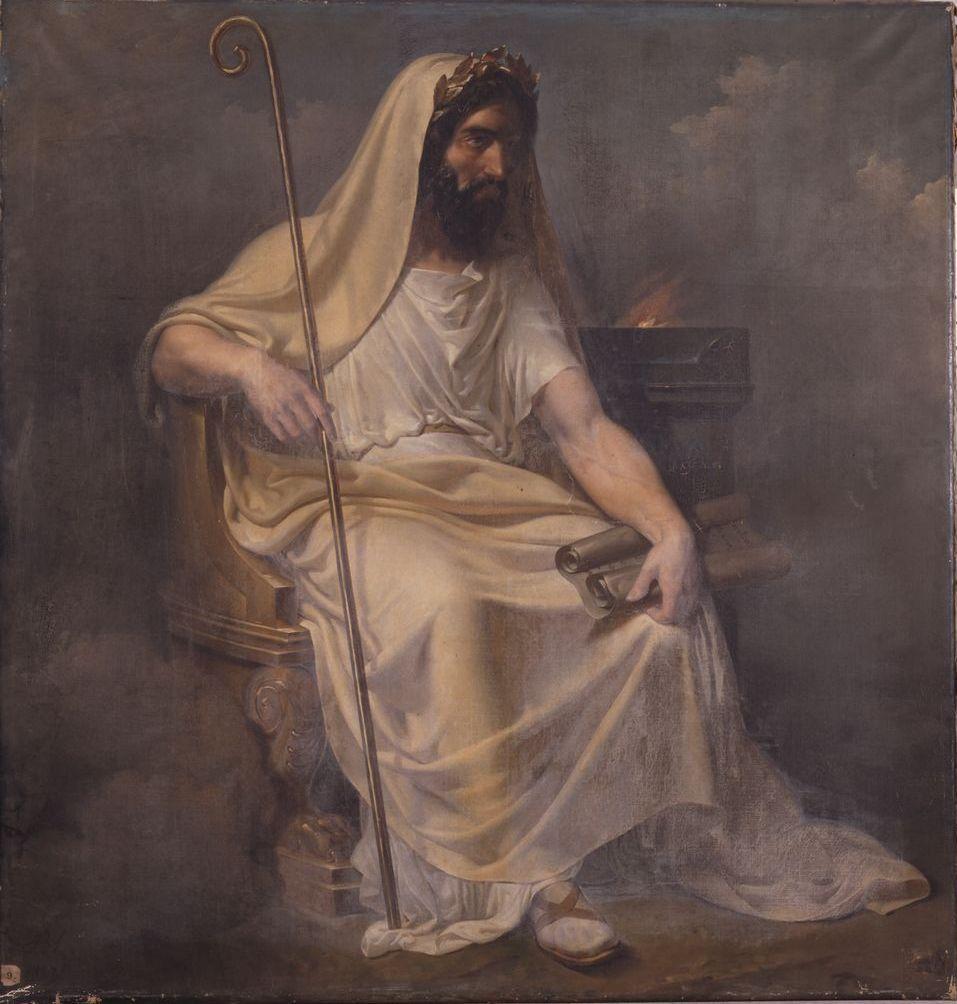figure (Numa Pompilius, homme, assis, de trois-quarts, roi, Romain, couronne : laurier, rouleau, bâton, effet de tissu, trône) ; nuée ; flamme
