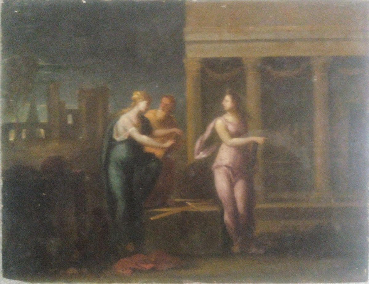 scène (femme ; vieillard ; colonne ; instrument de mesure ; compas ; ruines)