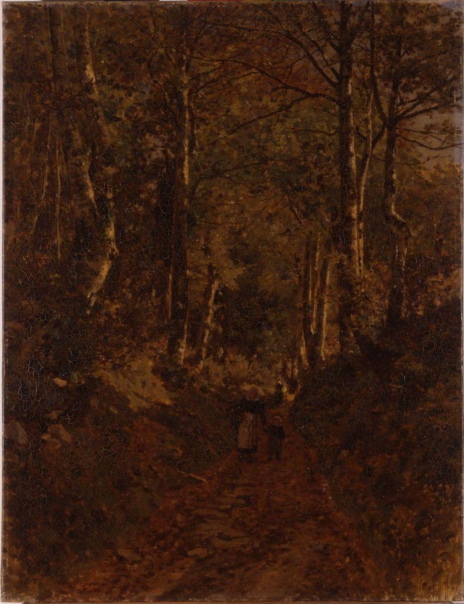 scène (femme ; enfant ; chemin ; tablier ; Bannalec) ; fond de paysage (forêt ; arbre)
