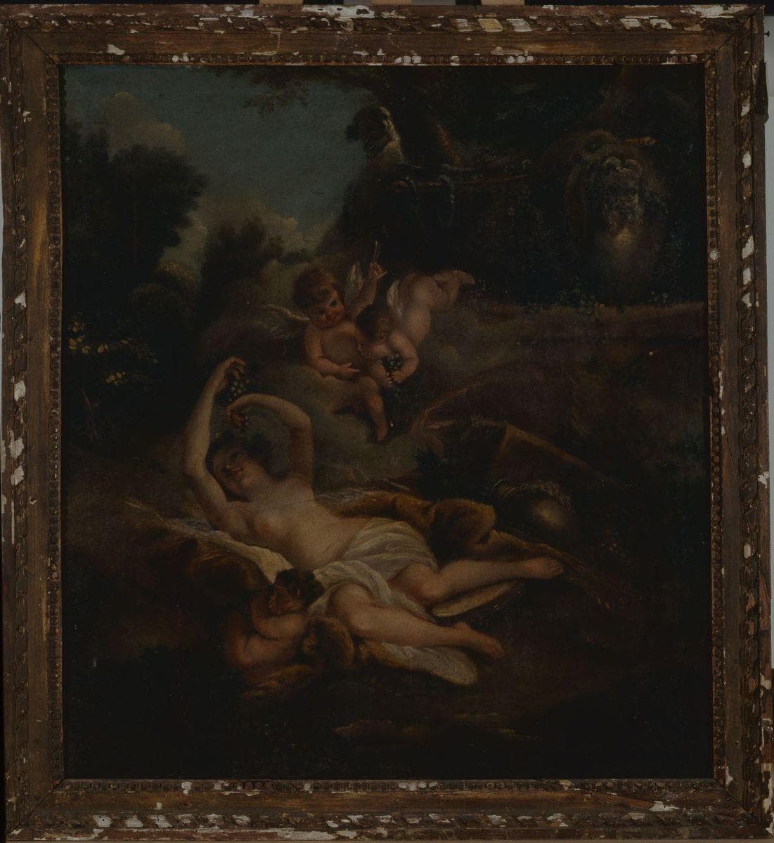 scène (femme : nu ; angelot ; raisin ; rocher ; draperie ; effet de tissu ; fourrure ; nu)