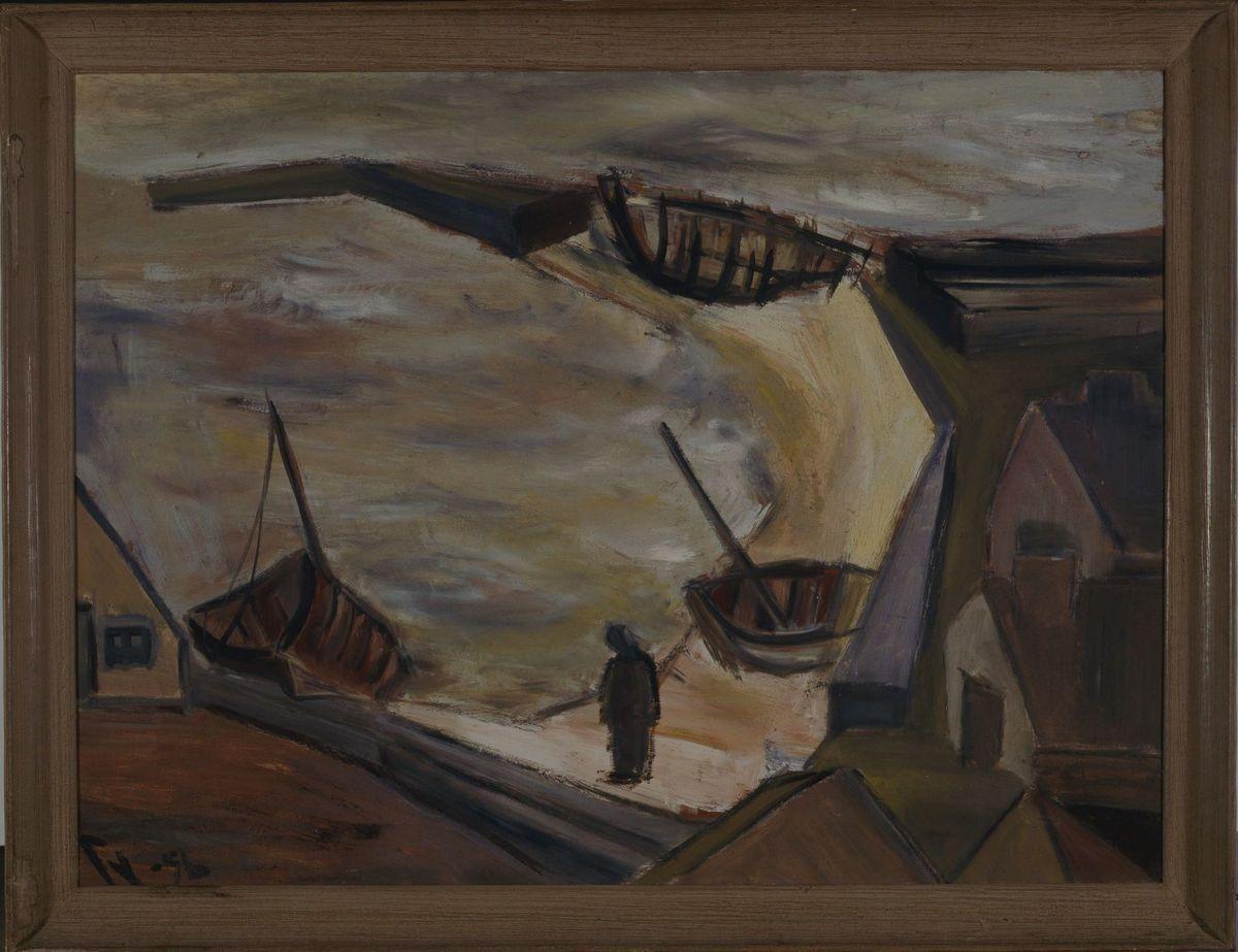 paysage (mer ; port ; bateau ; maison ; homme ; plage ; bord de mer ; bateau à voiles ; digue)