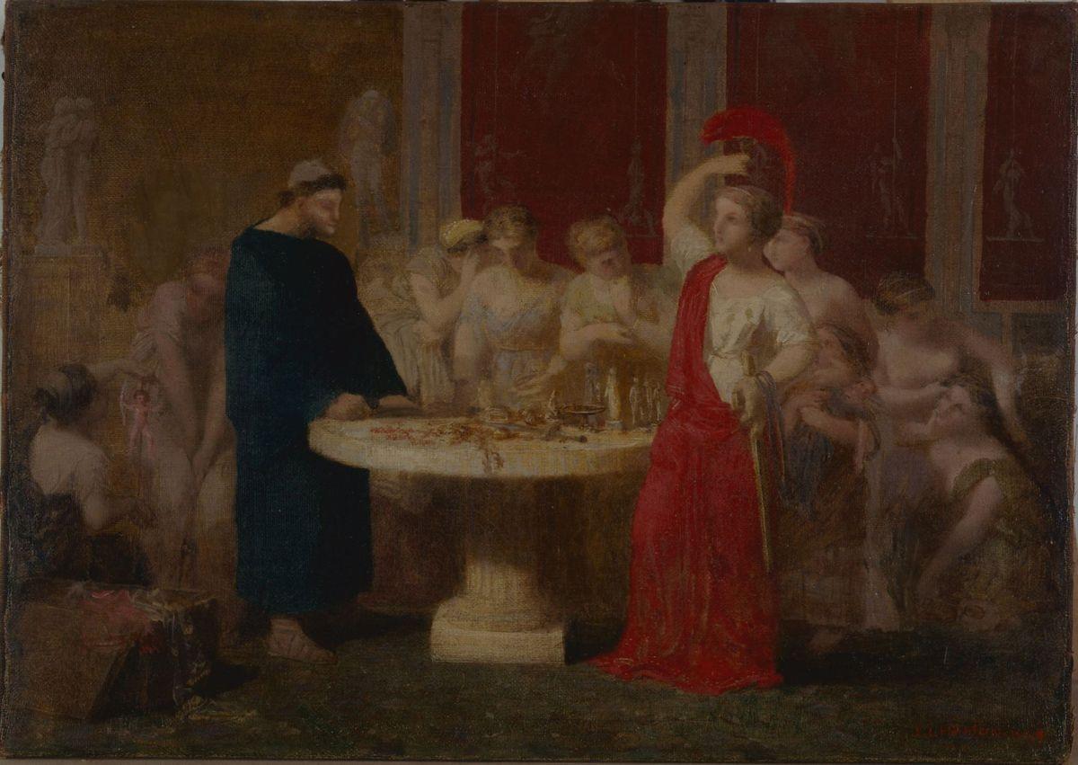 scène historique (femme ; épée ; sculpture ; table ; antiquité romaine)