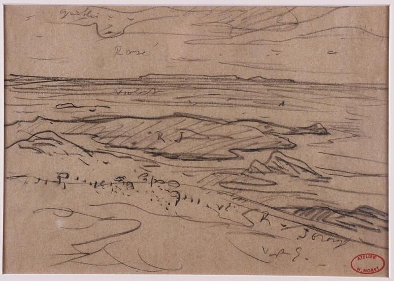 cachet d'atelier, en bas à droite : Atelier H. Moret ; annotation : Annotations sur les couleurs du paysage. : gris-bleu Rosé Violet ; numéro : HM 236
