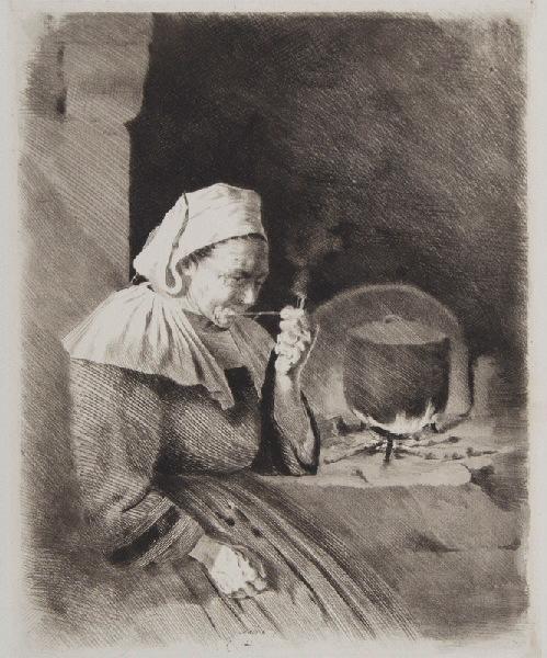 portrait d'inconnu (vieille, fumeur, pipe, âtre, marmite, Breton)