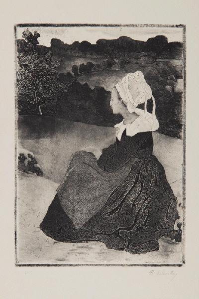 Femme en costume breton et portant une coiffe, assise de profil devant un paysage.
