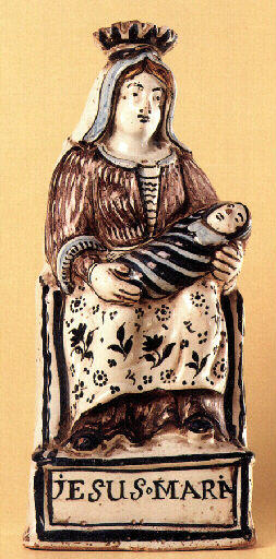 Vierge assise tenant l'enfant Jésus emmailloté dans ses bras. robe à semis de feurs (décor floral dans le genre Quimper) vertes, rouges et bleues