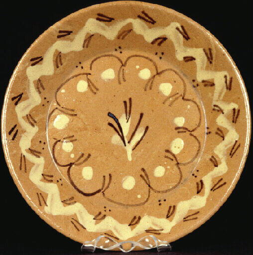 Terre rose. Décor à la touche : fond encadré d'un filet festonné brun pontué de touches jaunes. Au fond, touches jaunes et traits bruns composant un motif floral stylisé. Sur le marli : trèfles bruns, ligne de dents de loup jaune encadrée d'une double rangée de motifs floraux stylisés à triple traits en V bruns
