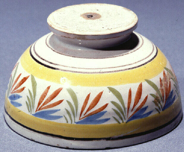 A pied. Décor polychrome sur émail blanc : frise de pétales entre filets jaunes et bruns