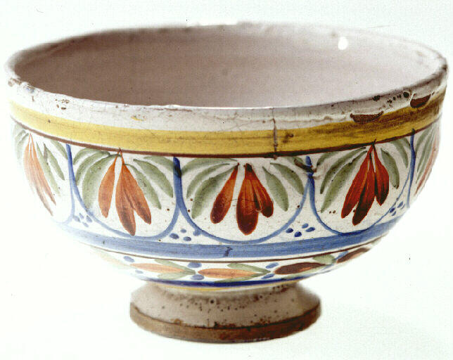 Bol à pied. Décor polychrome sur fond blanc : deux frises florales entre filets jaune, brun, bleu. Frise supérieure faite de pétales dans des demi-cercles ; frise inférieure formée de pétales et doubles points