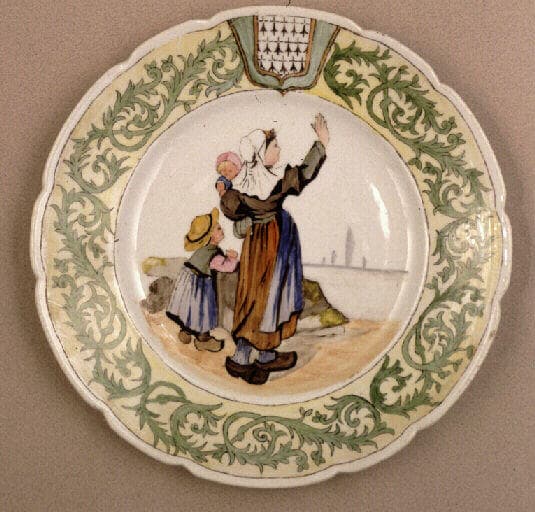 scène (femme, Bretonne, jeunesse, nourrisson, enfant) ; fond de paysage (mer, voilier) ; ornement à forme végétale (rinceau : feuillage orn) ; armoiries (hermine orn)