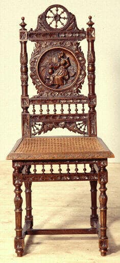 La fin du XIXe siècle vit l'apparition d'un nouveau type de mobilier breton, dont le succès ne se démentit que vers le milieu du siècle suivant. Ce style composite adaptait aux formes et aux fonctions du mobilier urbain - le fameux 'Henri II'- une thématique bretonne développée dans une surenchère ornementale. Bureaux, lits bas, coiffeuses ou casiers à musique répondaient au souci de commodité bourgeoise ; le décor breton satisfaisait l'attachement provincial des nouvelles couches urbaines bretonnes ou émigrées. Ces meubles ne sortaient plus d'ateliers ruraux, mais de maisons installées dans les villes bretonnes, ou même de manufactures parisiennes du faubourg Saint-Antoine : Amiot (Vitré), Blancho (Vannes), Coignerai (Nantes), Le Corre (Auray), Sterviniou (Châteauneuf-du-Faou), etc. Les formes de ces meubles n'étant pas régionales, leur origine bretonne s'affirma dans une surabondance de motifs considérés comme les plus caractéristiques à la région. La mécanisation permettait une débauche de fuseaux, et les sculpteurs couvrirent les panneaux, les cariatides et les piétements de personnages en costume et de scènes de genre : fileuses en coiffe, sonneurs, paysan au pichet de cidre, etc