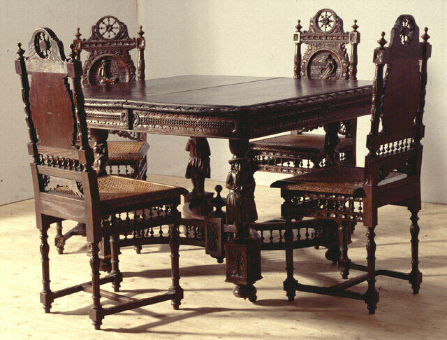 La fin du XIXe siècle vit l'apparition d'un nouveau type de mobilier breton, dont le succès ne se démentit que vers le milieu du siècle suivant. Ce style composite adaptait aux formes et aux fonctions du mobilier urbain - le fameux 'Henri II'- une thématique bretonne développée dans une surenchère ornementale. Bureaux, lits bas, coiffeuses ou casiers à musique répondaient au souci de commodité bourgeoise ; le décor breton satisfaisait l'attachement provincial des nouvelles couches urbaines bretonnes ou émigrées. Ces meubles ne sortaient plus d'ateliers ruraux, mais de maisons installées dans les villes bretonnes, ou même de manufactures parisiennes du faubourg Saint-Antoine : Amiot (Vitré), Blancho (Vannes), Coignerai (Nantes), Le Corre (Auray), Sterviniou (Châteauneuf-du-Faou), etc. Les formes de ces meubles n'étant pas régionales, leur origine bretonne s'affirma dans une surabondance de motifs considérés comme les plus caractéristiques à la région. La mécanisation permettait une débauche de fuseaux, et les sculpteurs couvrirent les panneaux, les cariatides et les piétements de personnages en costume et de scènes de genre : fileuse en coiffe, sonneurs, paysan au pichet de cidre, etc